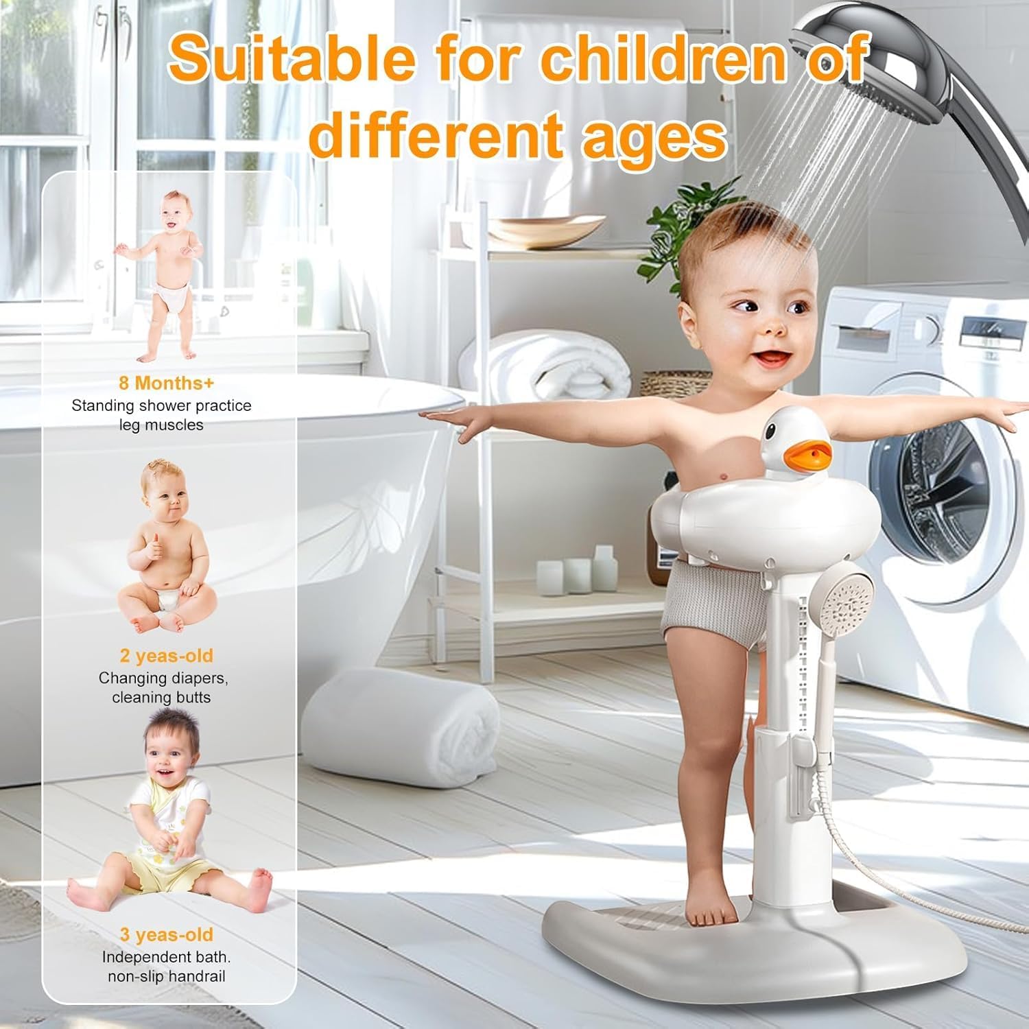 Fohome Baby Shower Stand Support,Adjustable Bath Stand with Anti-Slip Base,Baby Bath Helper,Smart Water Flow Hug Tower Bath Support, Huggable Duck Bath Support for Infants & Toddlers