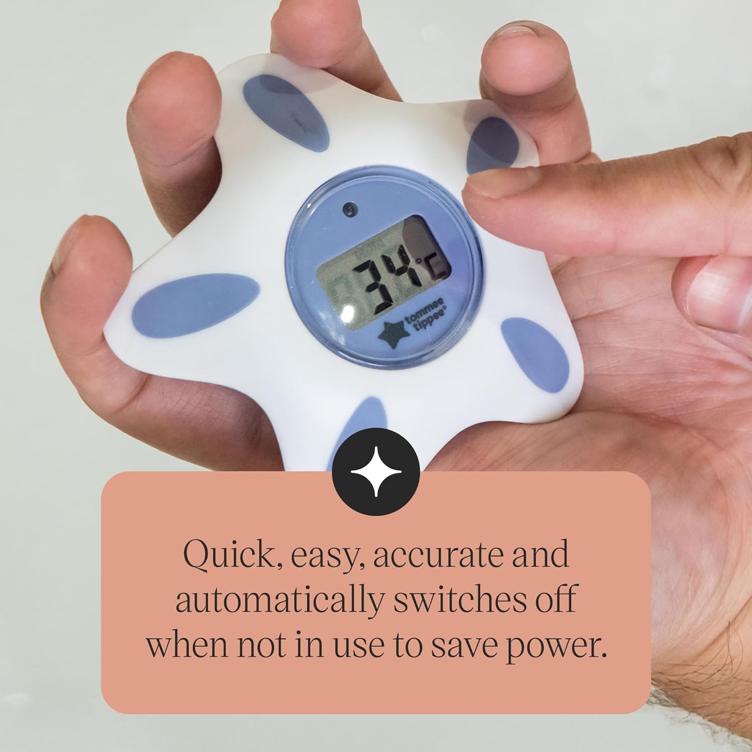 Tommee Tippee InBath Digital Thermometer for Baby Bath and Room, Waterproof and Floats in Water, 3 Second Readings on Easy to Read LCD Display is made for safe and soothing bath-time use. Suitable for delicate baby skin, it supports stress-free and hygienic bathing.